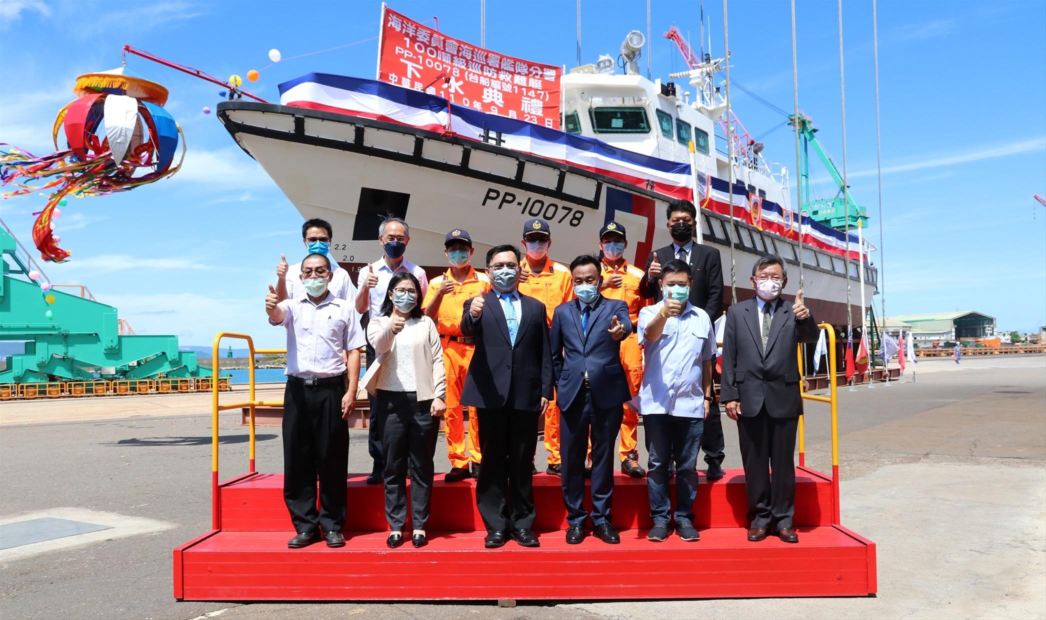 圖說:台船建造海巡署艦隊分署 100噸級巡防救難艇(台船編號HNO.1147)新船下水典禮貴賓合影。