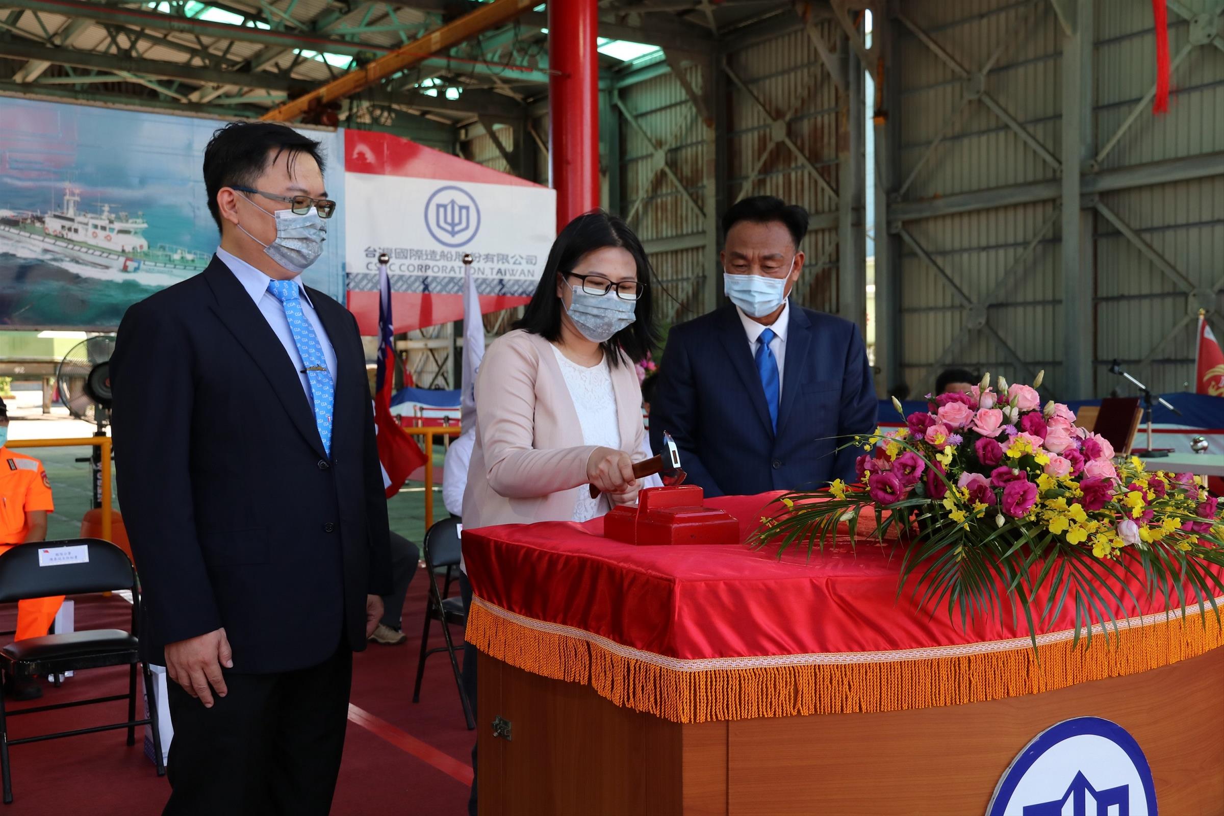 圖說:左起海巡署艦隊分署陳泰廷主任秘書、擲瓶人主任秘書夫人黃淑美女士、台船公司基隆廠朱有亮廠長