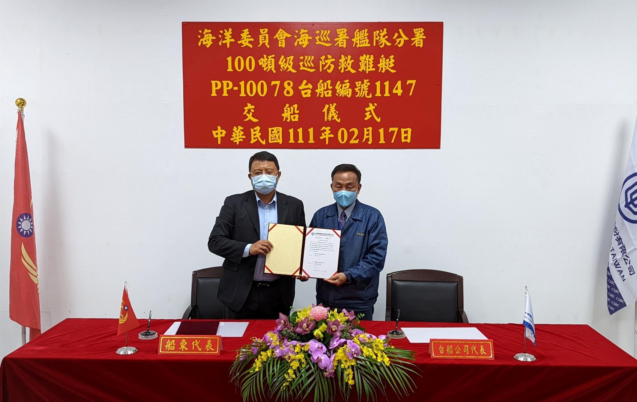 圖說:100噸級巡防救難艇PP-10078交船典禮(左)海巡署艦隊分署吳金河副分署長、(右) 台船公司基隆廠朱有亮廠長共同主持