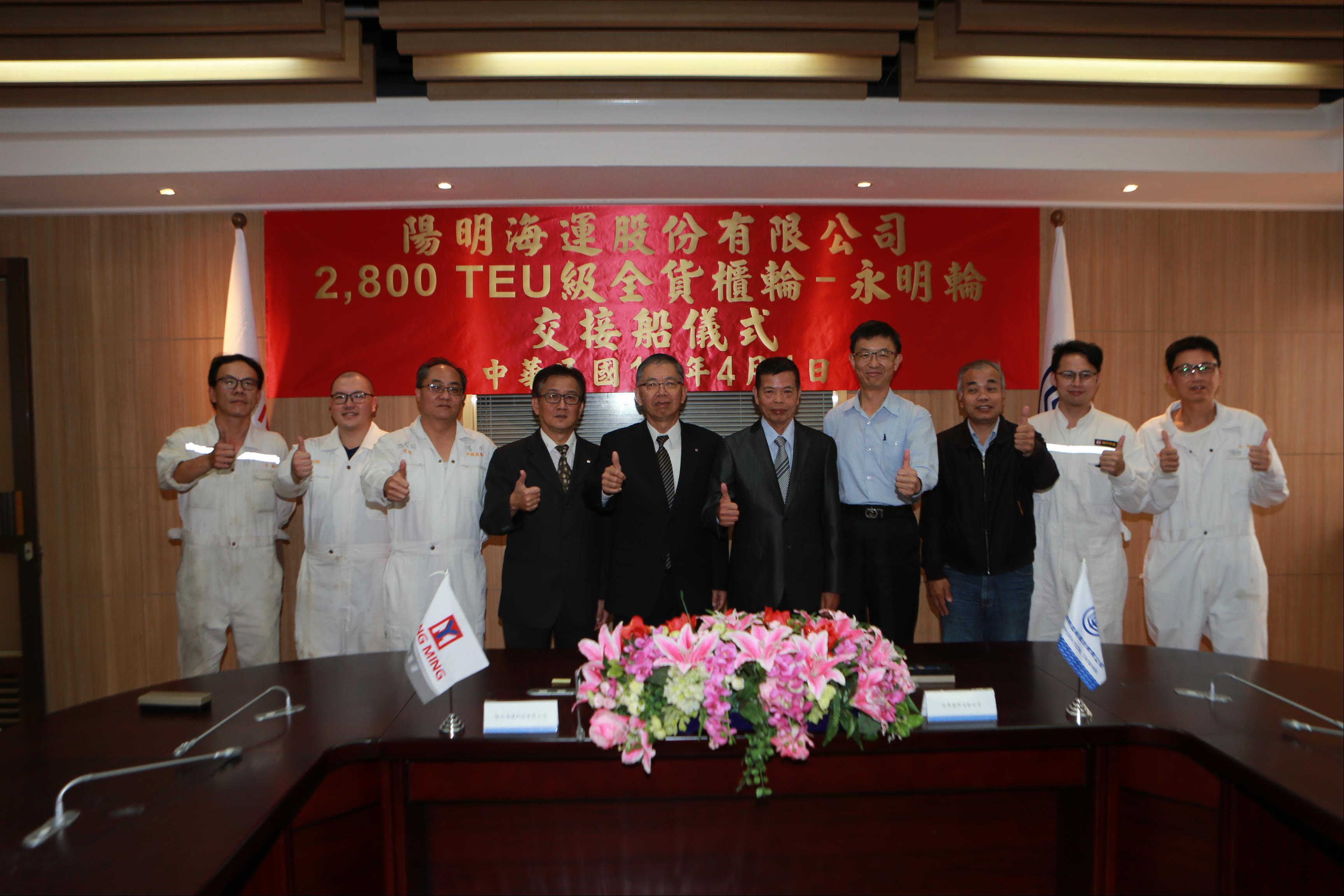 台船公司為陽明海運建造2,800 TEU級全貨櫃輪「永明輪」交船文件簽署