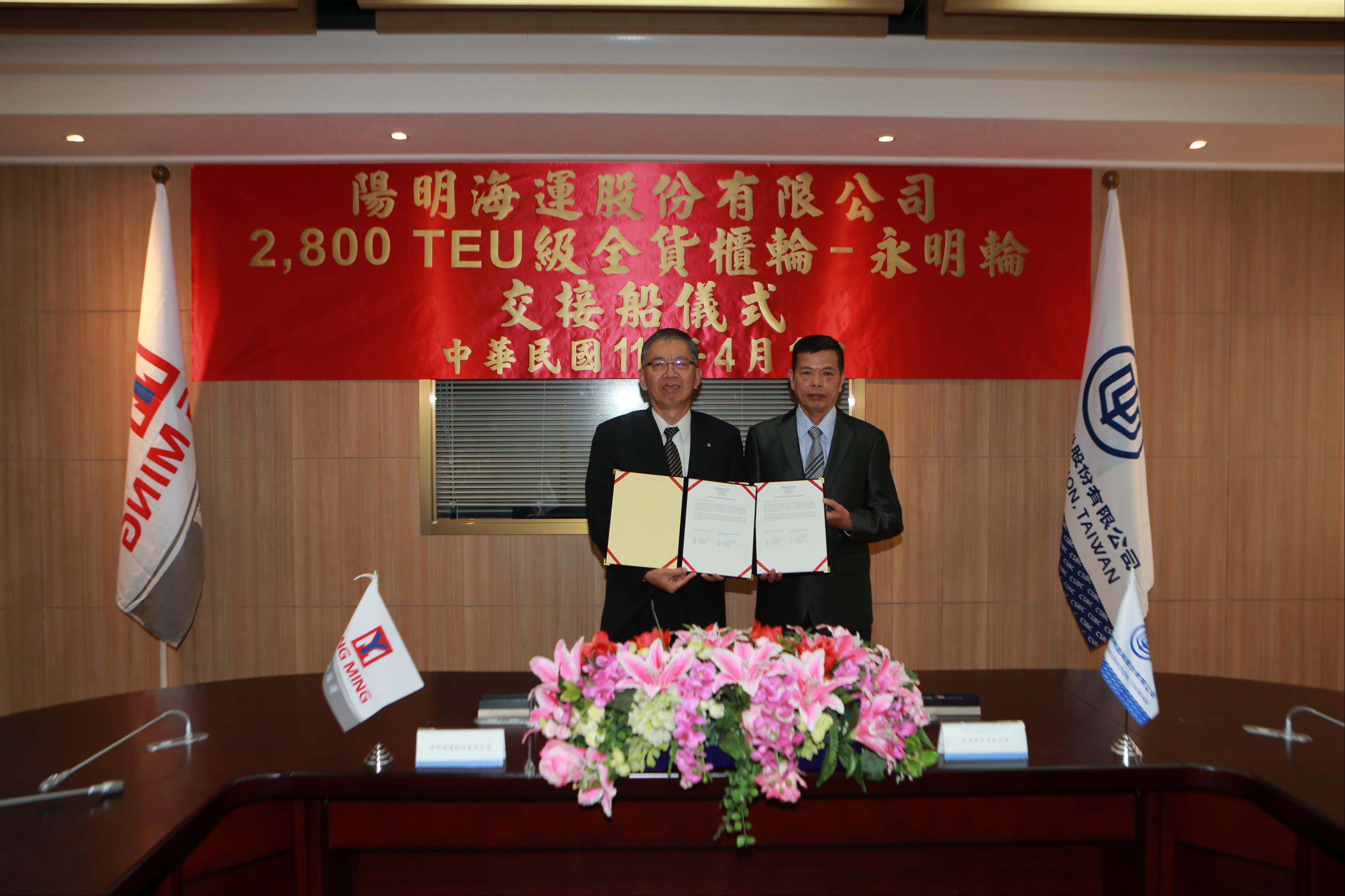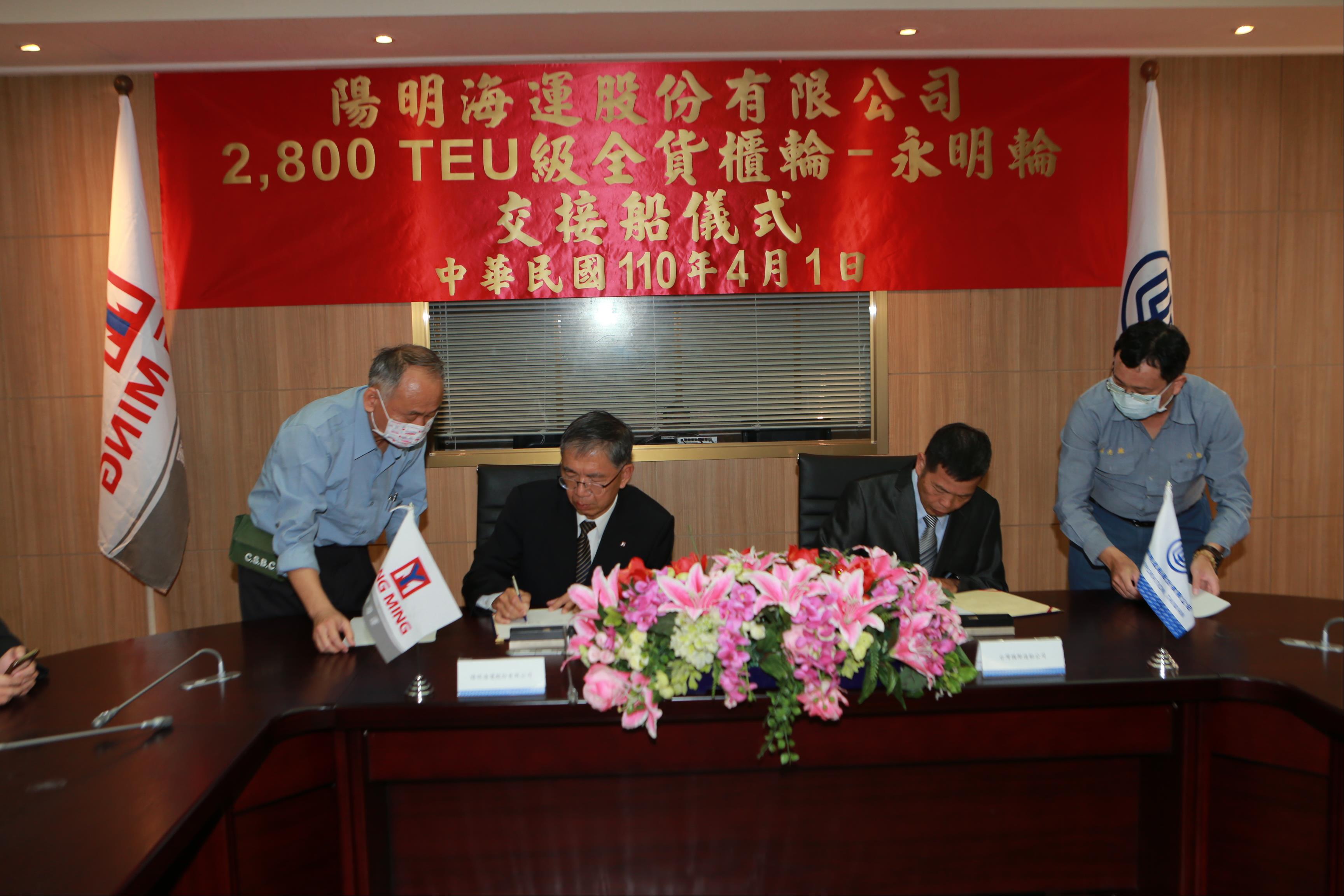 110年04月01日上午,陽明海運公司代表蒞臨台灣國際造船公司,簽署2,800 TEU級全貨櫃輪 - 「永明輪」交船文件。本儀式由台灣國際造船公司魏正賜副總與陽明海運公司何永順技術長進行簽署,並邀請重要貴賓親臨見證。在簽署交船文件後,代表完成本輪的產權轉移。本輪於台船轉移給陽明公司後,將投入陽明海運亞洲區間JTS航線,有助於陽明海運進一步提升亞洲區間航線營運績效。