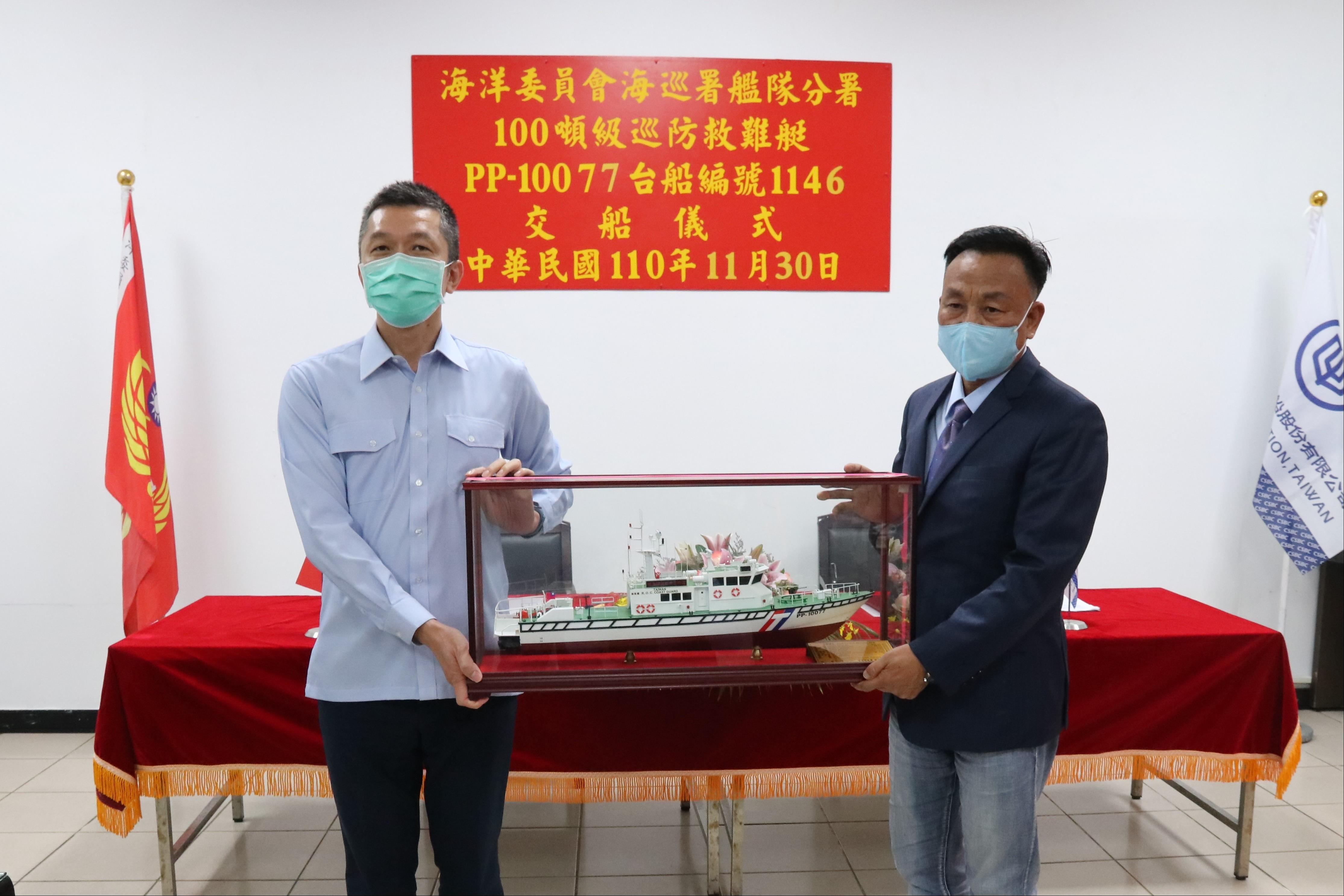 交船典禮台船公司基隆廠朱有亮廠長將PP-10077巡防救難艇模型移交給海巡署艦隊分署蘇澳海巡隊,海巡署艦隊分署吳金河副分署長見證交船儀式。