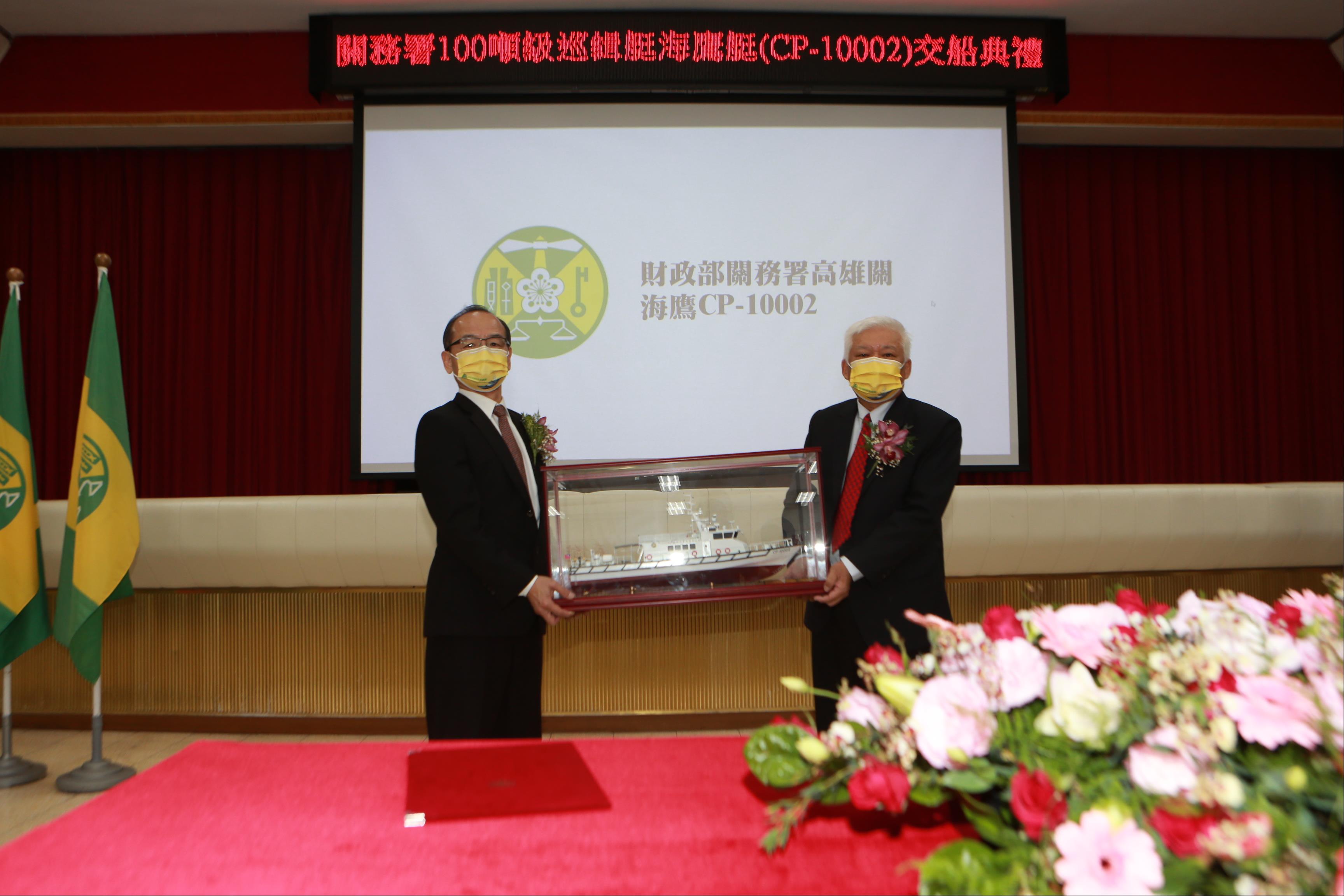 圖說:CP-10002海鷹艇交船典禮船模致贈(左)高雄關陳木榮關務長、(右)台船公司顏聰輝副總經理