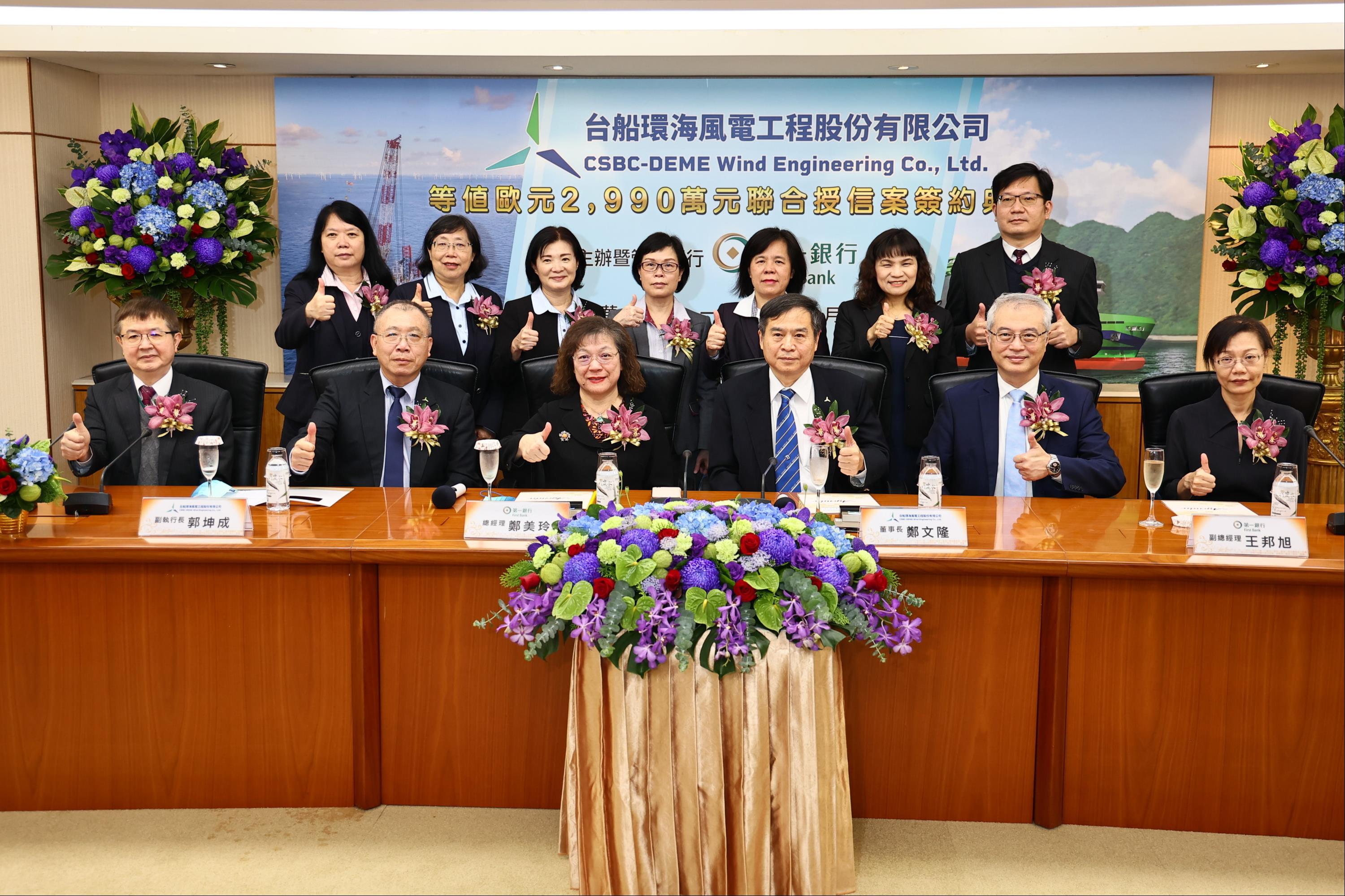 台船環海與第一銀行特別假第一銀行總行大樓舉行簽約儀式,典禮簡單而隆重,由第一銀行總經理鄭美玲以及台船環海公司董事長鄭文隆共同主持,現場除了主辦銀行第一銀行,另有兆豐、華南、土銀、合庫、彰銀及台企銀等六家參貸銀行代表出席,共同見證台灣離岸風電產業融資在地化的珍貴時刻。