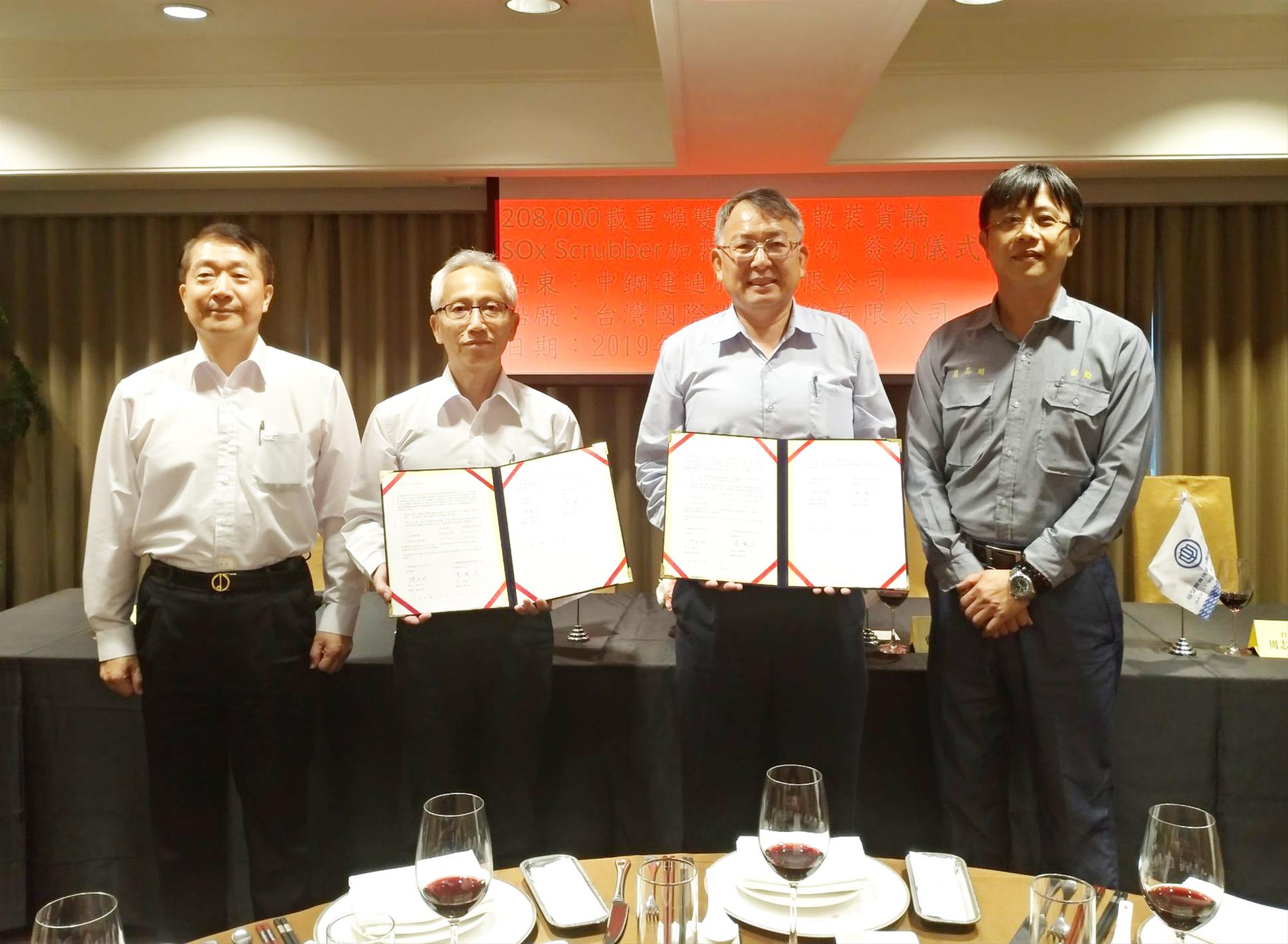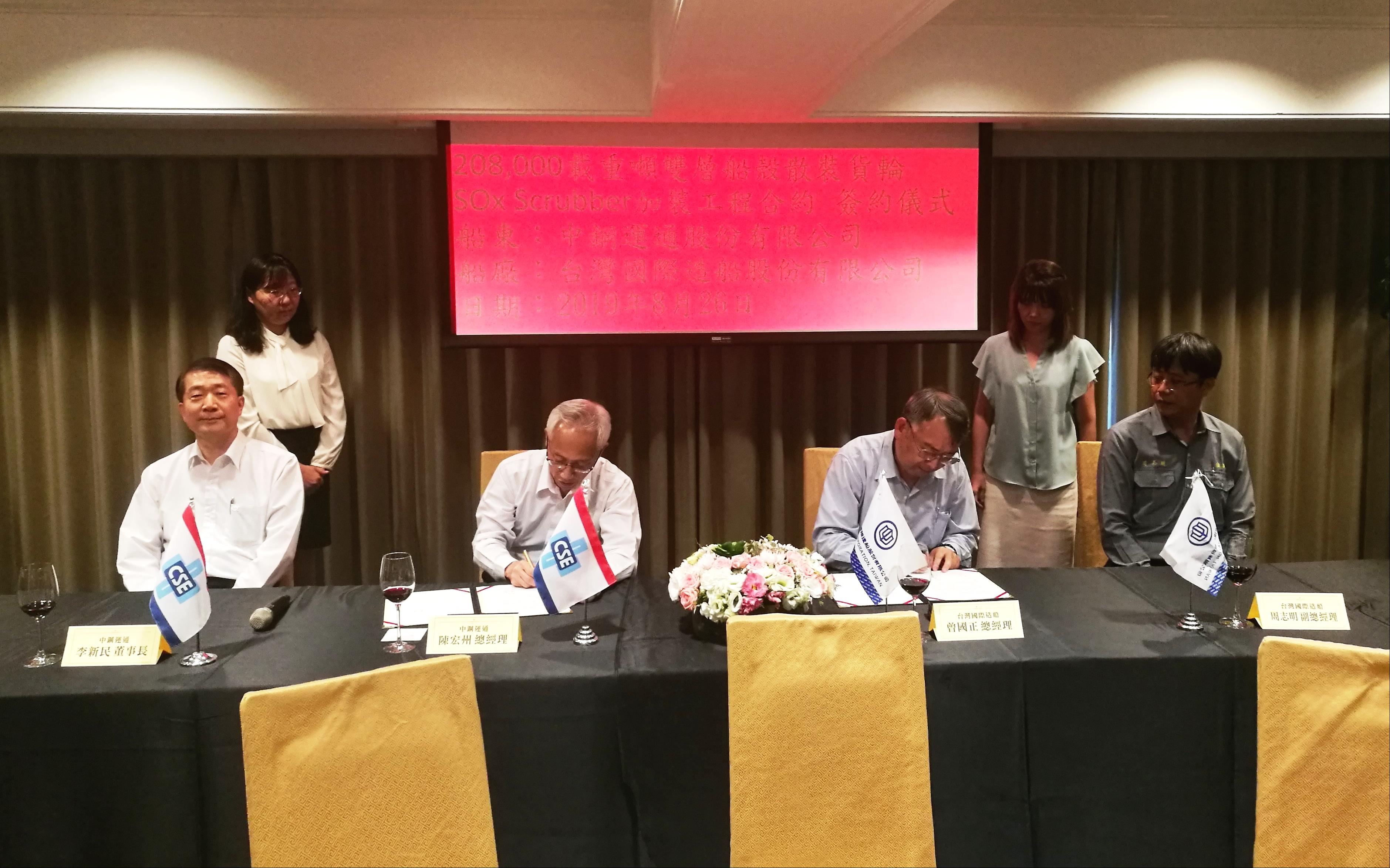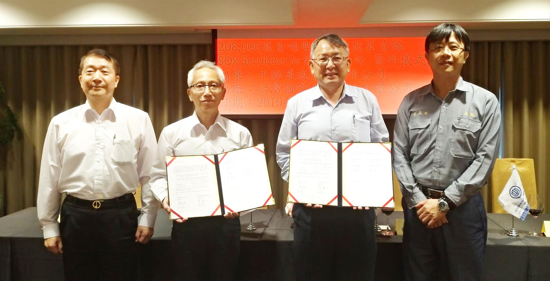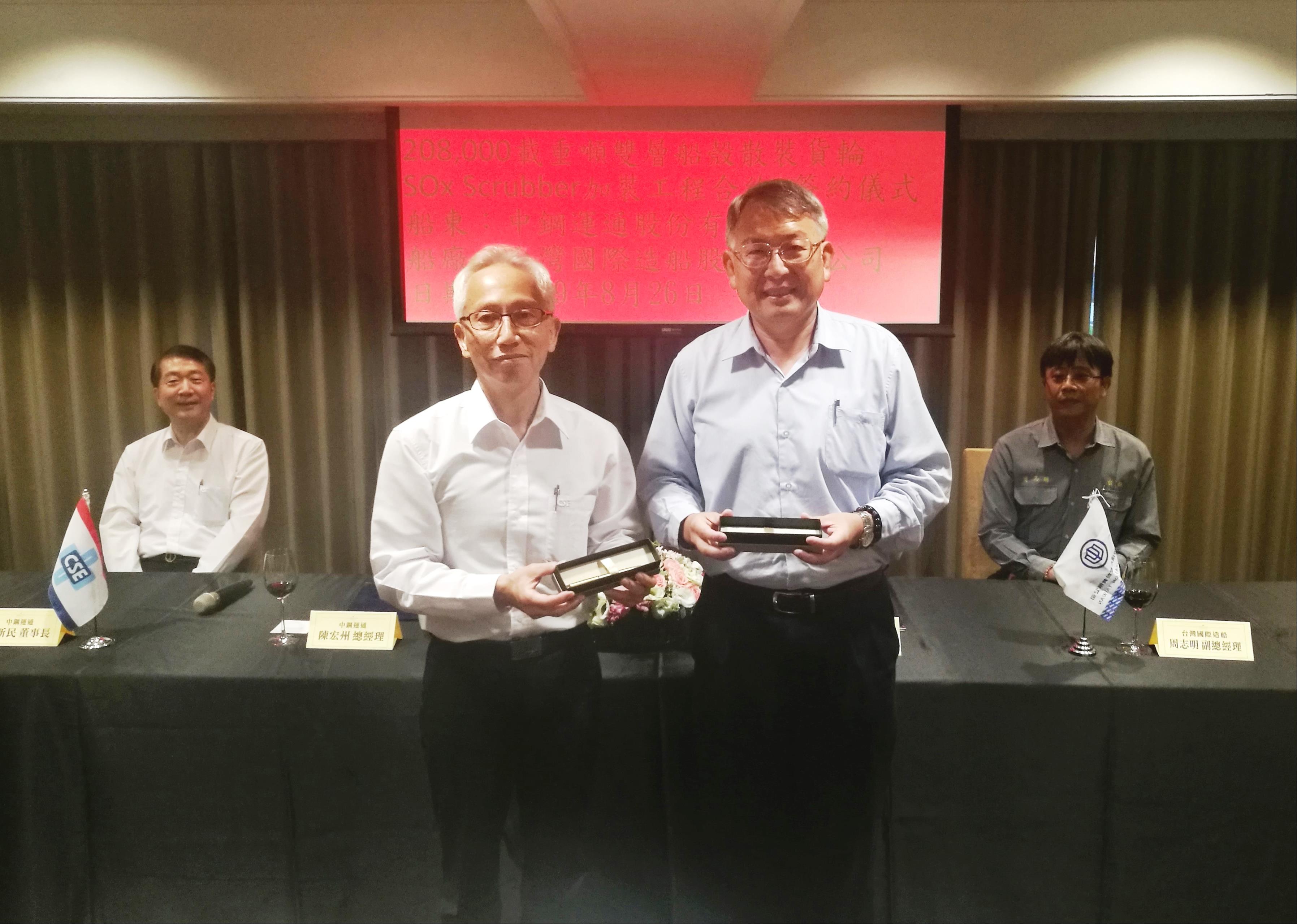 台灣國際造船股份有限公司(下稱”台船公司”)26日於高雄國賓大飯店,與中鋼運通股份有限公司(下稱”中運公司”),簽訂2艘「208,000載重噸雙層船殼散裝貨輪SOx Scrubber加裝工程合約」,由台船公司總經理曾國正與中運公司總經理陳宏州代表簽署。