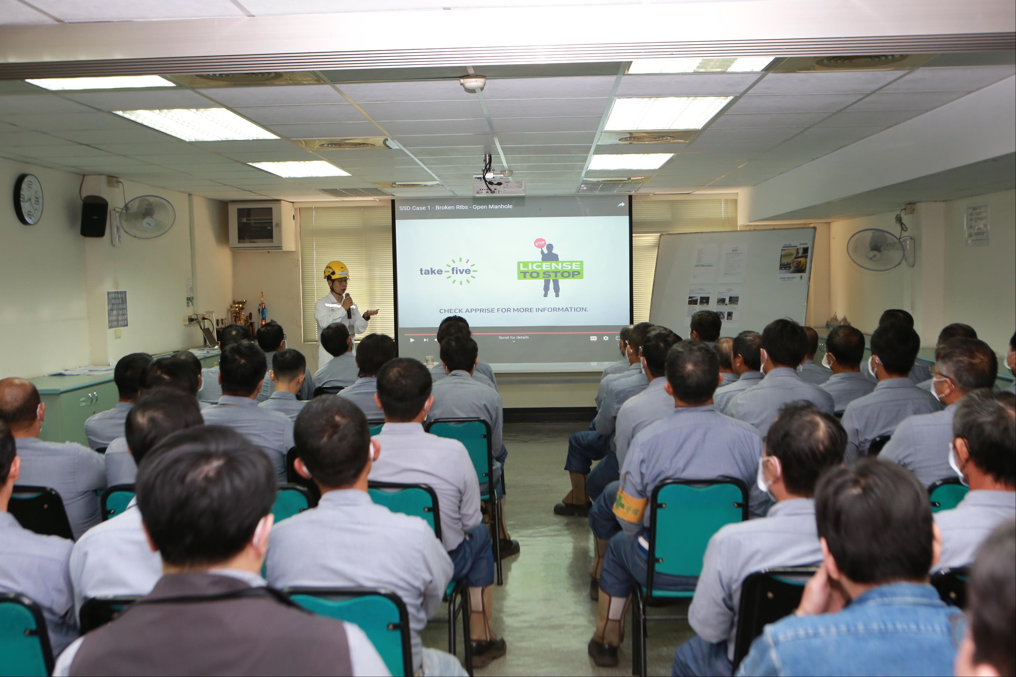 台船公司同樣重視工安宣導,向船東代表、現場人員、承攬商宣導施工安全之重要性,也藉此機會加入造船工安案例,透過圖片及影片的方式警惕所有員工務必在任何工作進行時,確保安全防護細節,並且在施工時小心謹慎。
