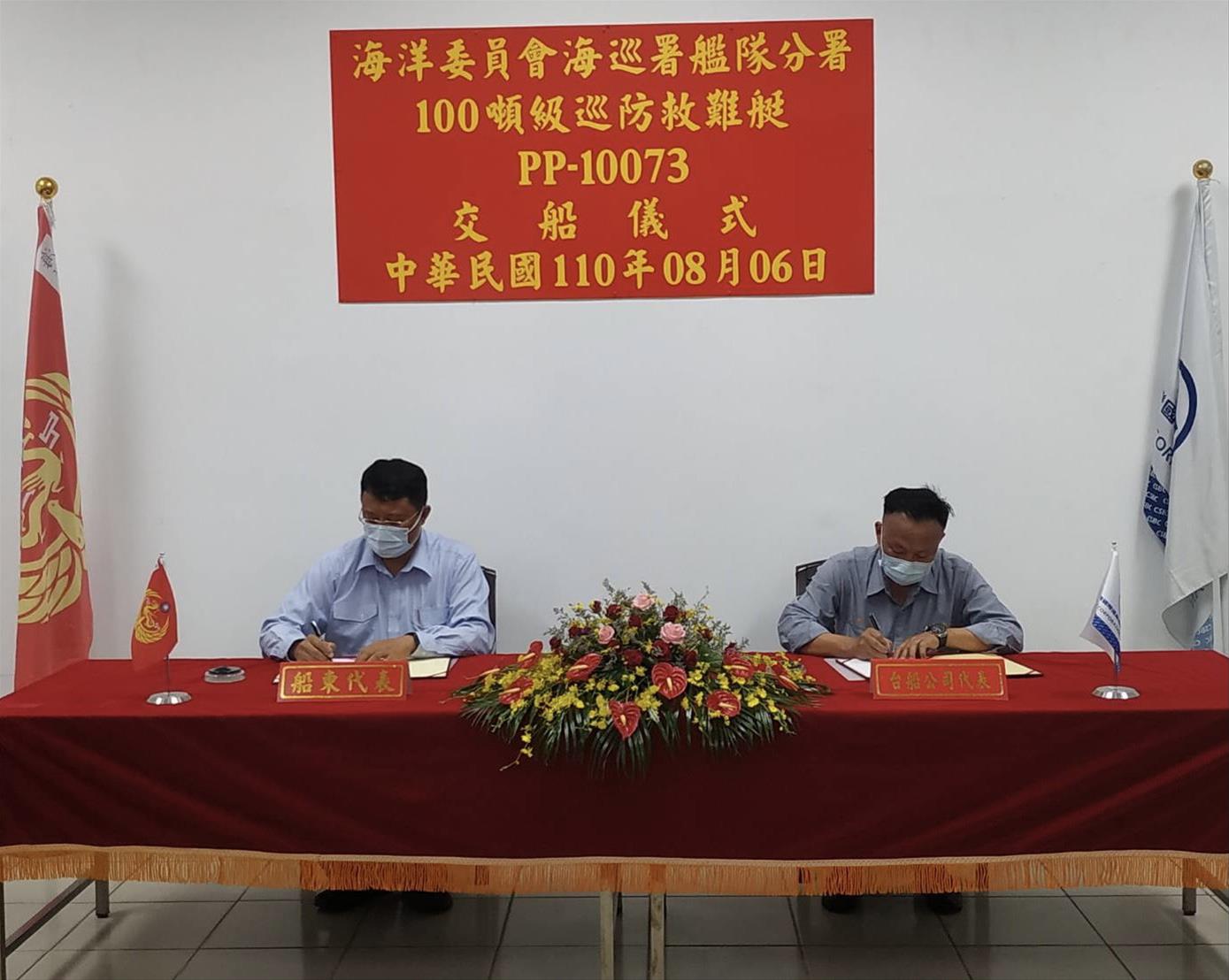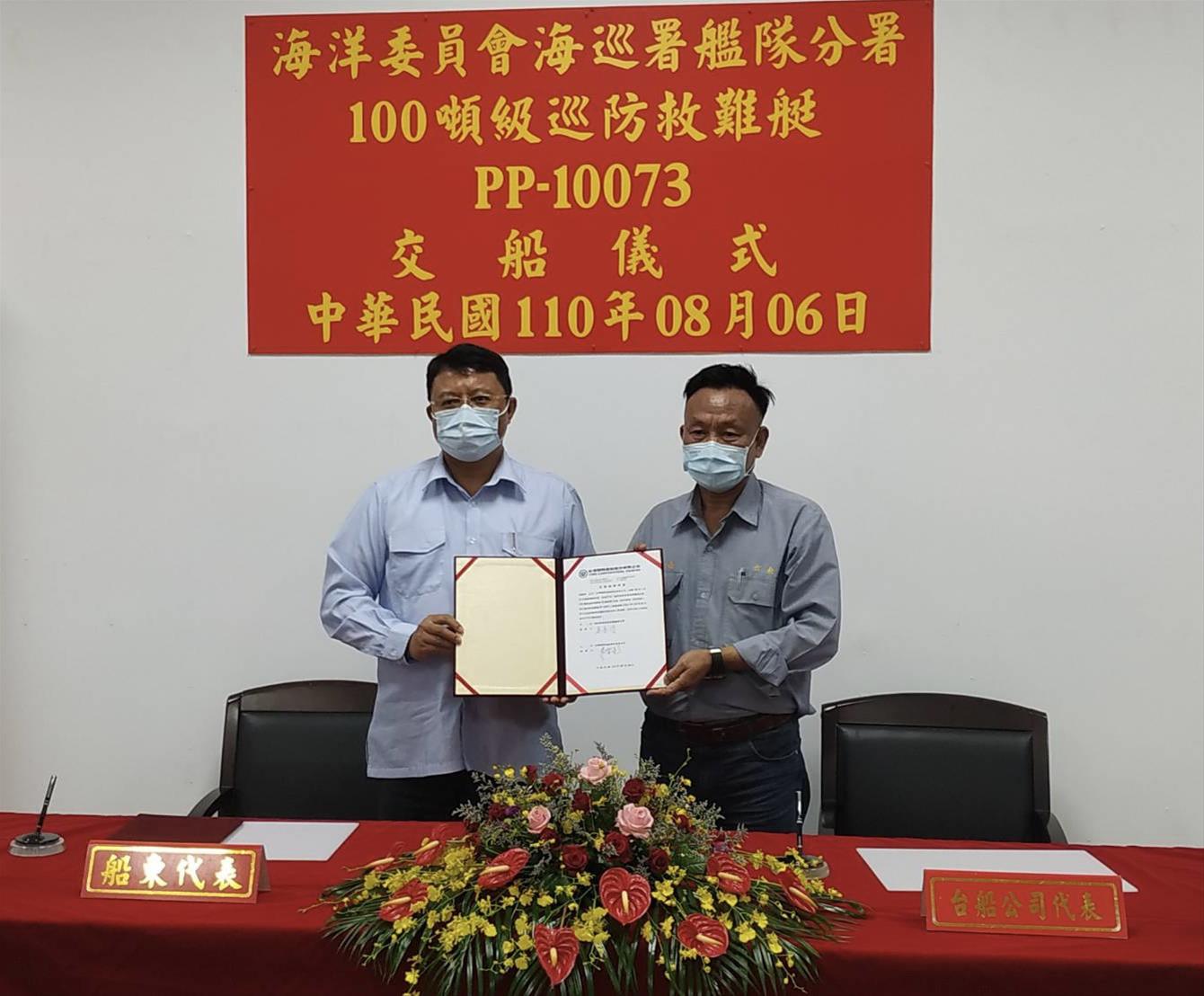 圖說:100噸級巡防救難艇PP-10073交船典禮(左)海巡署艦隊分署吳金河副分署長、(右) 台船公司基隆廠朱有亮廠長共同主持