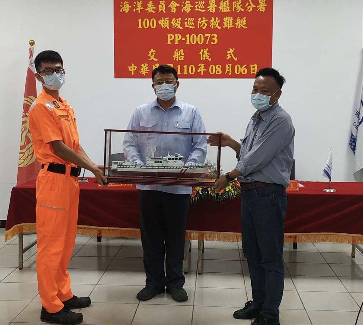 本次典禮敬邀海巡署長官、船舶暨海洋產業研發中心、中國驗船中心、BV驗船中心等貴賓到場觀禮。儀式中台船公司基隆廠朱有亮廠長將PP-10073巡防救難艇模型贈予海巡署艦隊分署金門海巡隊李浩名艇長,海巡署艦隊分署吳金河副分署長見證交船儀式。