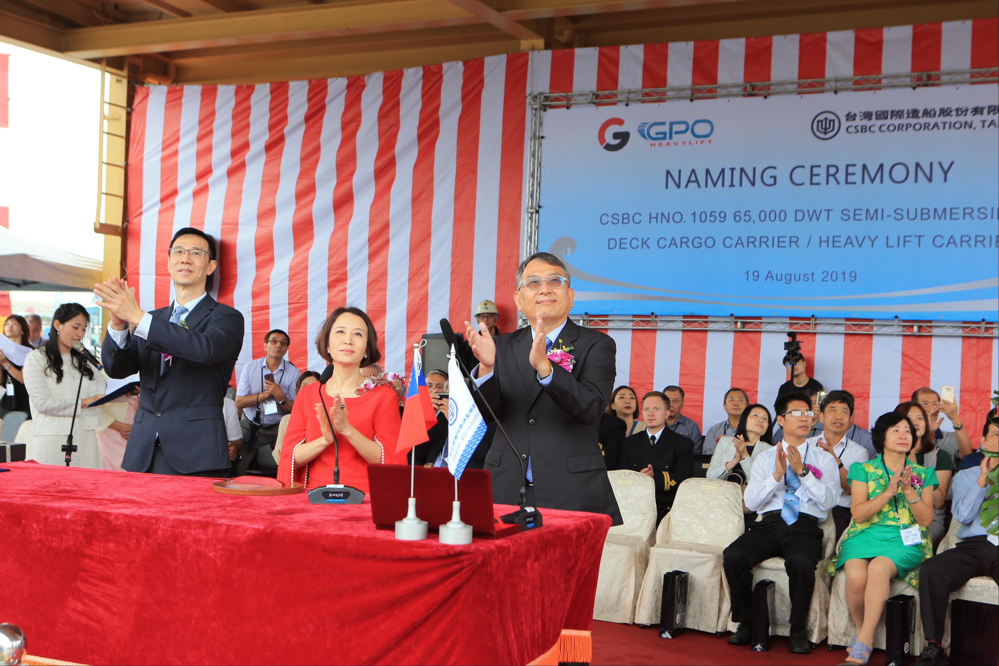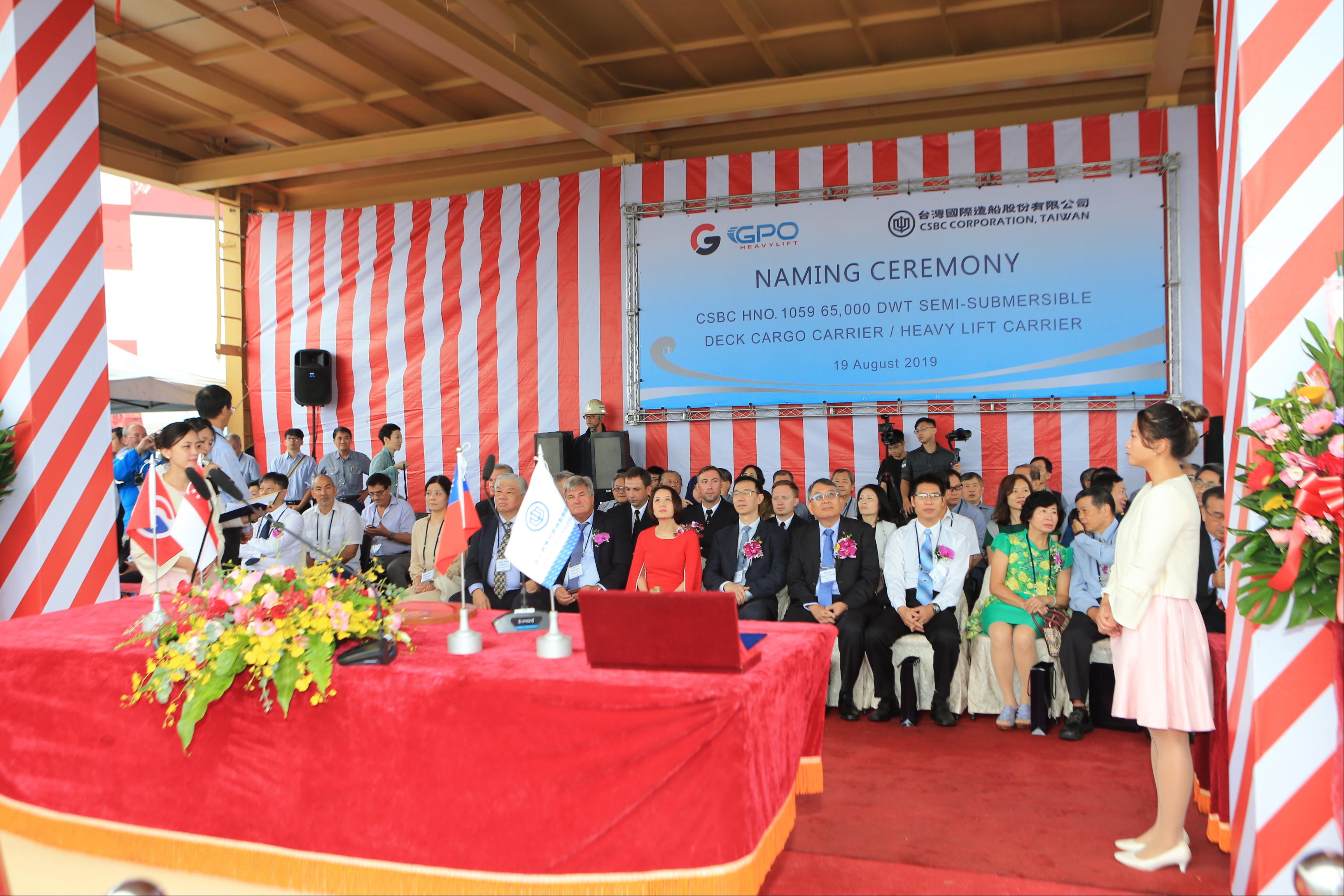 台灣國際造船(股)公司(以下簡稱”台船公司”)於2019年8月19日上午10時00分於3號碼頭舉行「65,000載重噸級潛舉式甲板重貨載運輪(台船編號1059)命名典禮」,典禮由台船公司曾國正總經理與GPO集團蔡文星執行長共同主持,並邀請蔡雯婷女士為此輪命名及擲瓶,典禮會場貴賓雲集,熱鬧非凡!