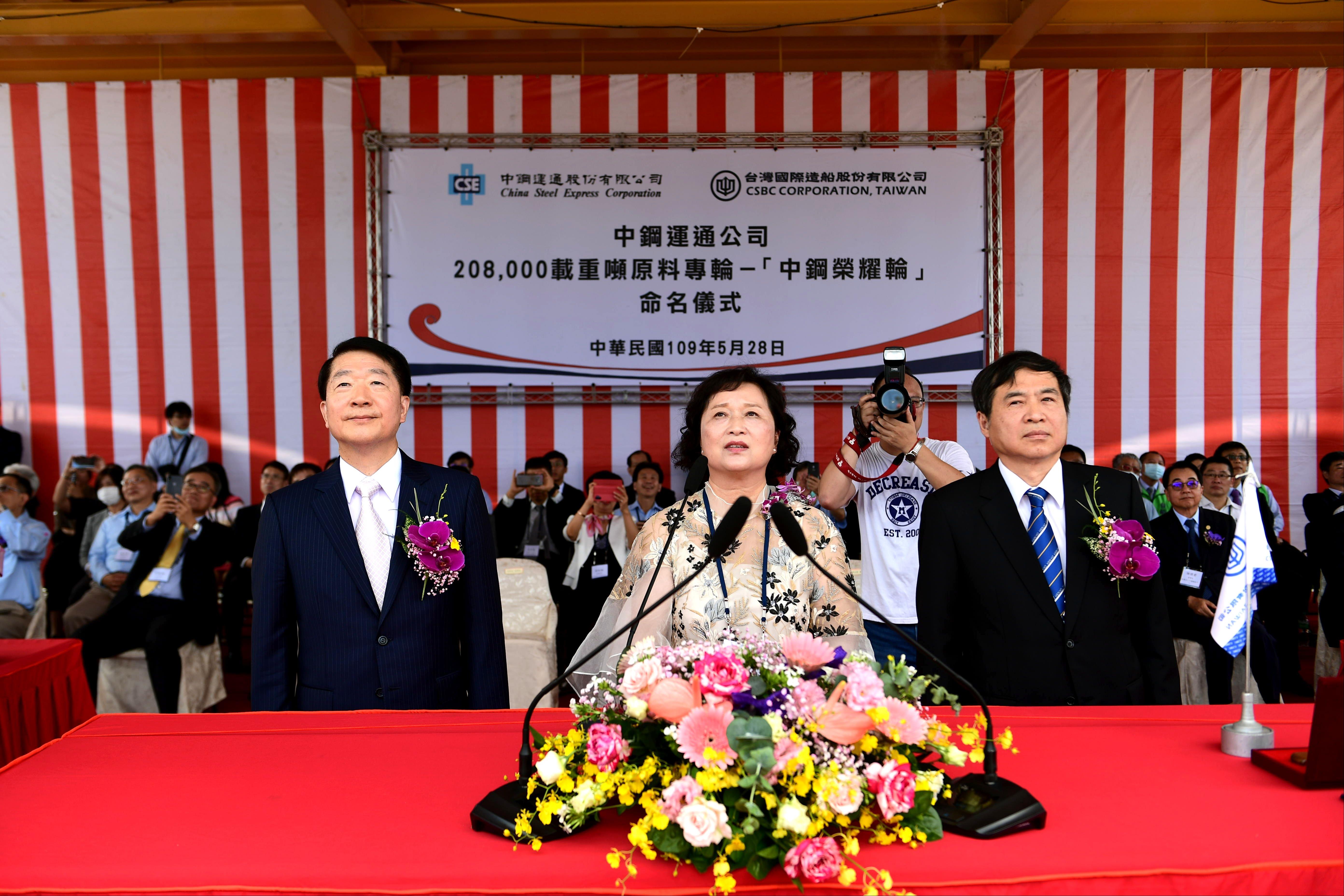 圖說:左起中鋼運通董事長李新民、命名人鄭旨芬女士、台船公司董事長鄭文隆。